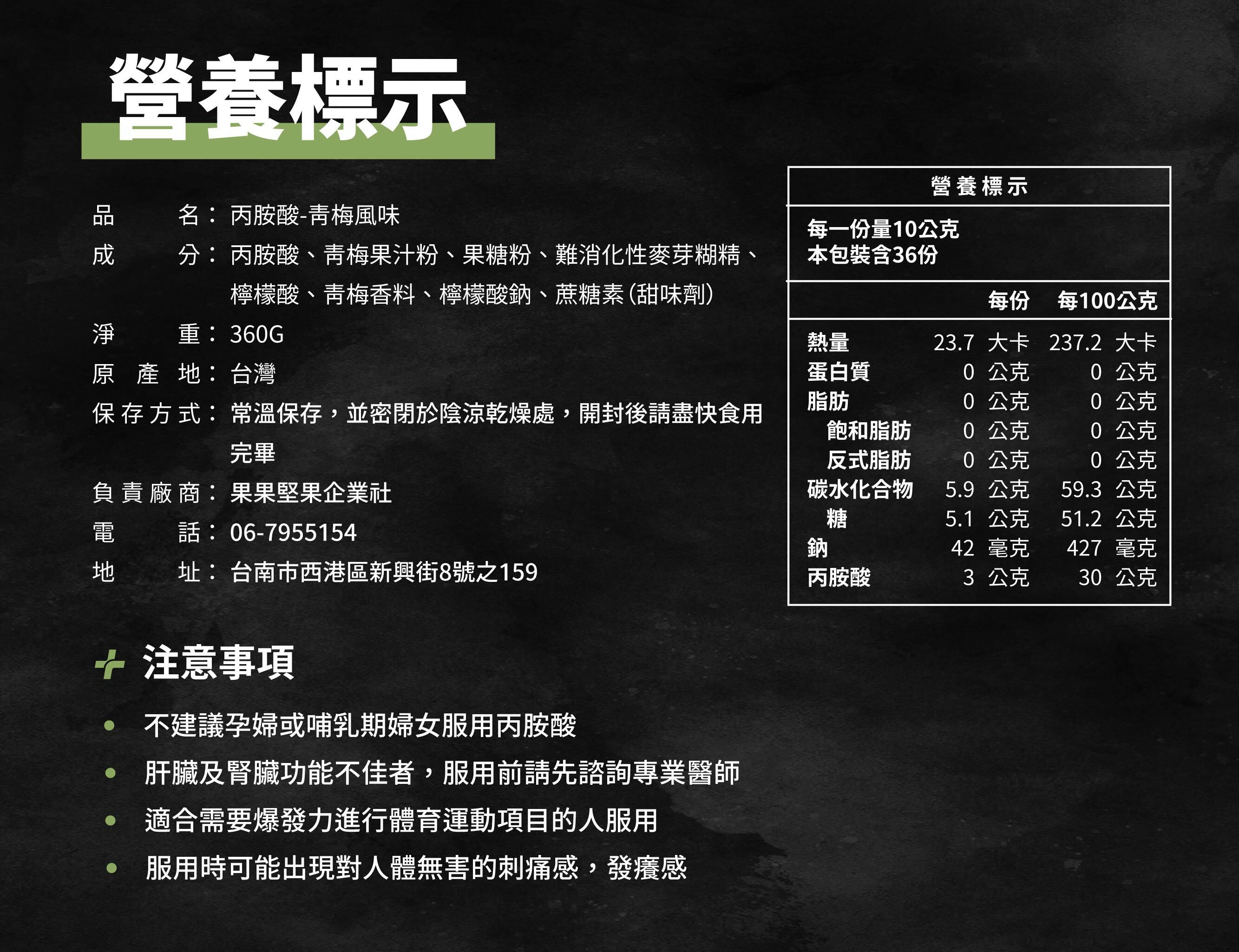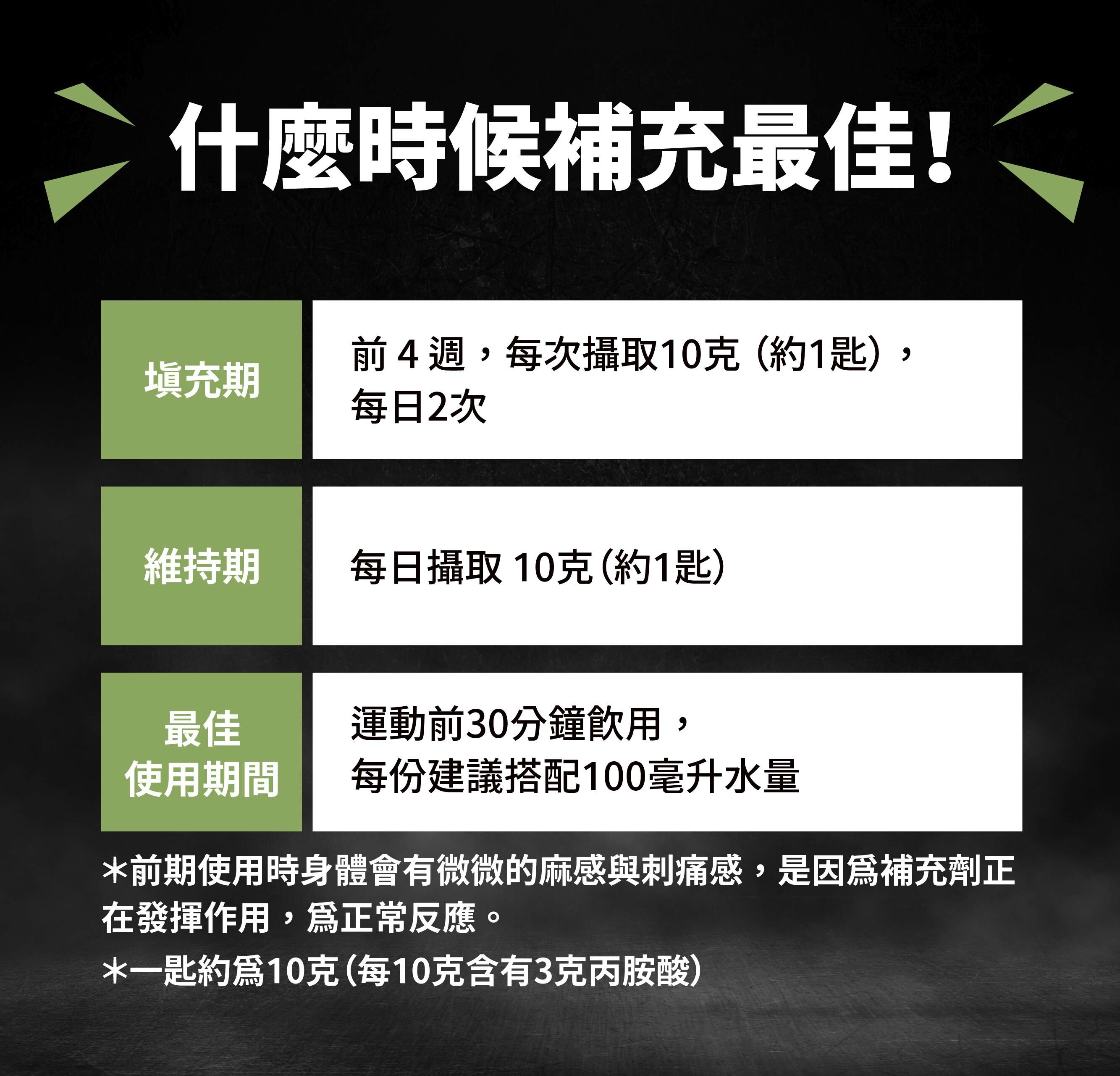 • 建議每次取用一湯匙(10g),每 10g 粉末含有 3g 丙胺酸