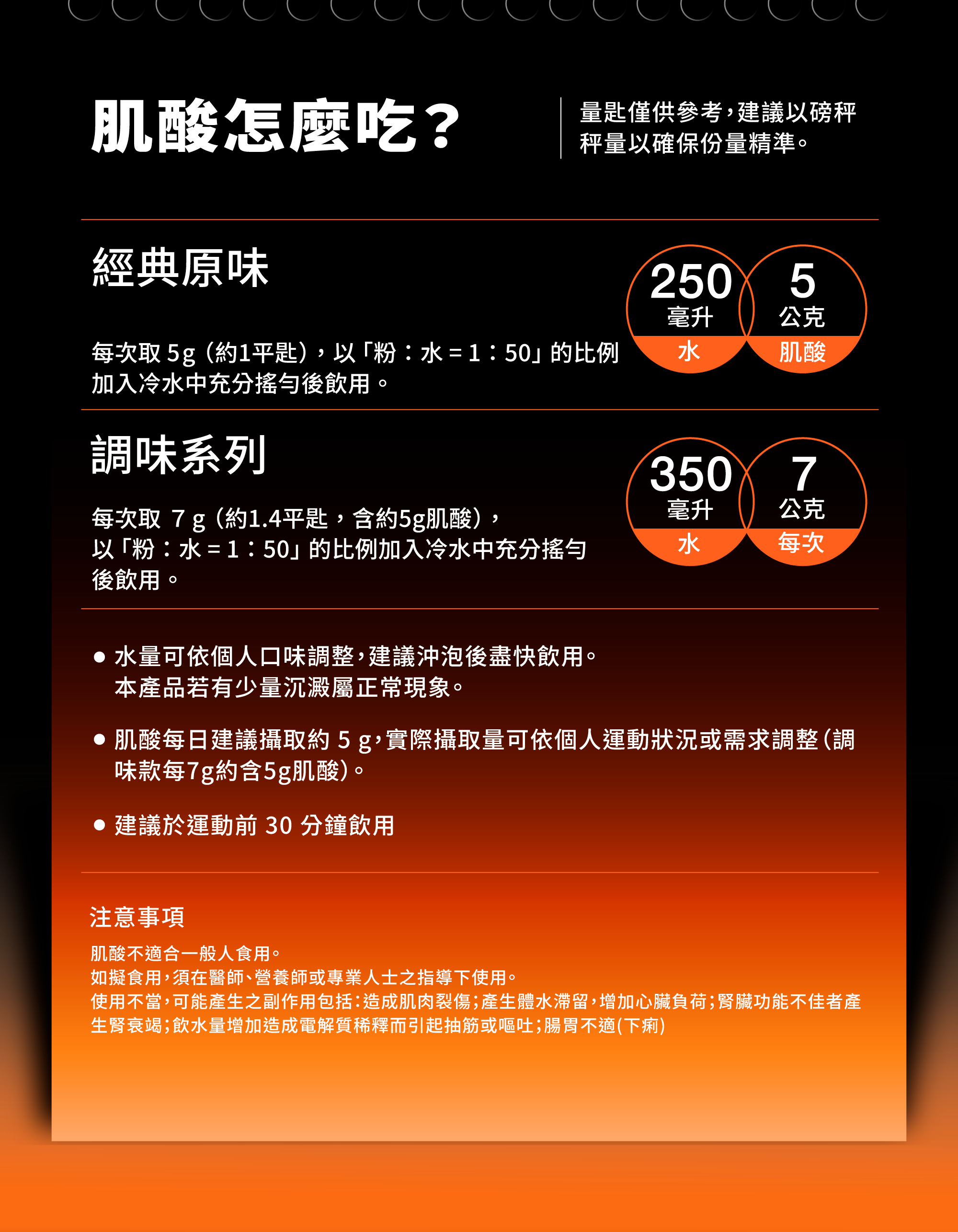● 肌酸每日建議攝取約 5g,實際攝取量可依個人運動狀況或需求調整(調味款每 7g 約含 5g 肌酸)。