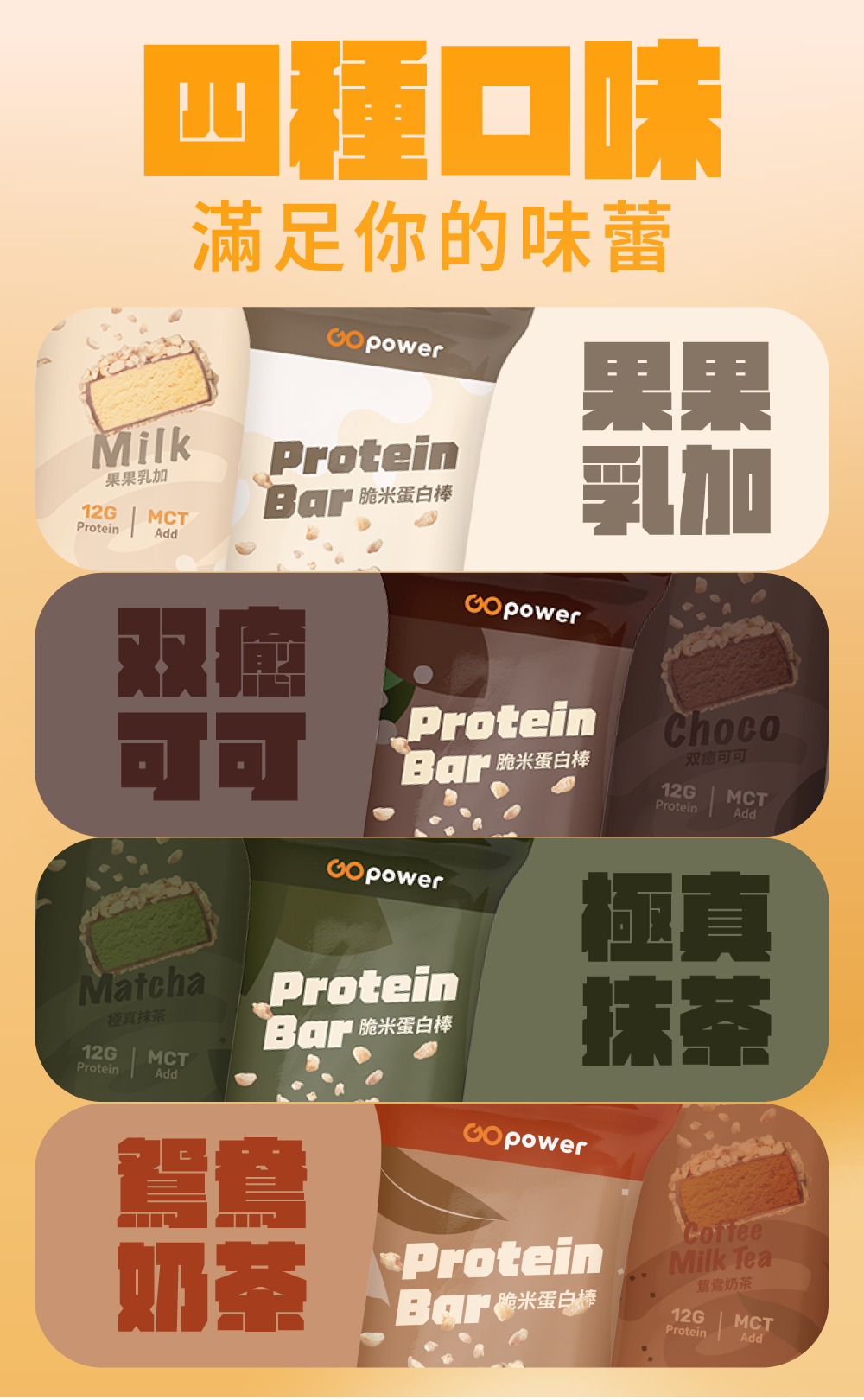 脆米蛋白棒共有四種口味:双癒可可、極真抹茶、果果乳加、鴛鴦奶茶,香甜耐咀嚼又口感滿滿的脆米蛋白棒,是飲食控制時期最佳的高蛋白零食,每份含有 12 克蛋白質
